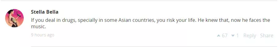 网民Stella Bella说,如果你贩毒,尤其是在一些亚洲国家贩毒,那么你就是在拿自己的生命开玩笑。谢伦伯格知道这个后果,所以他现在就得面对这样的下场。