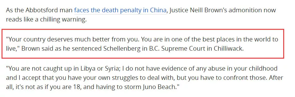 但在CBC曝光的这些谢伦伯格过往在加拿大国内贩毒的"事迹"中,最讽刺的一点莫过于他在2012年被法官判处入狱16个月时,宣判他的法官布朗(Neill Brown)还曾在法庭上"劝他善良"。 "你生活在全世界上最好的一个国家,这样一个国家值得你表现得更好",布朗在宣判谢伦伯格时这样说到。他还特别叮嘱谢伦伯格"永远不要低估这种犯罪的严重性"。