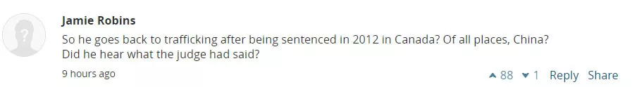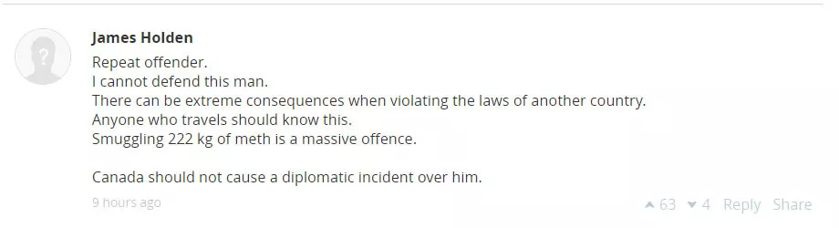 网民James Holden也表示:他无法给这么一个屡教不改的人辩护,而且走私200多千克冰毒是很严重的罪行了。这位网友还认为加拿大政府不该为了这么一个恶劣的毒贩去挑起外交事端。