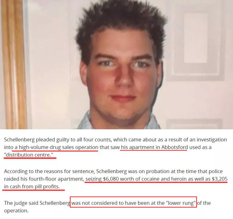 根据加拿大广播新闻网(以下简称CBC)的报道,这个谢伦伯格在7年前,就曾经因为贩毒而被加拿大法院判处了16个月有期徒刑。 而且CBC获得的加拿大的法庭文件还显示,当时谢伦伯格的家被加拿大警方发现是一个贩卖毒品的窝点,警方从中查获了价值近7000加元(约合3.5万多元人民币)的可卡因和海洛因,以及3000多加元的贩毒赃款。这在当时还被警方视作是一起大案,谢伦伯格更被认定为主犯,而不是一般的马仔(lower rung)。