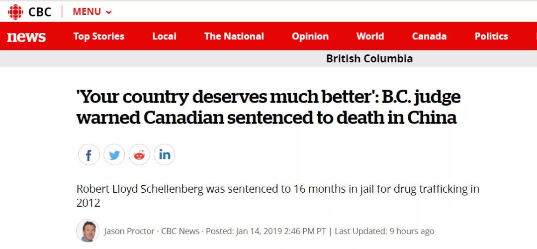 14日晚,中国大连法院一审依法判处走私200多千克冰毒进入中国境内的加拿大籍毒贩谢伦伯格死刑。 然而,加拿大政府却将此案不断政治化,横加干涉。在中方的法律学者和媒体充分阐述此案属于再审、不适用"二审不加刑"且谢伦伯格亦是法院根据新证据而被重判后,加拿大政府以及加拿大总理特鲁多仍然指责我们的判决是"武断的",并要求我们释放这个走私了200多千克冰毒的恶徒。 但就在昨天凌晨,加拿大主流媒体加拿大广播新闻网却突然刊登了一篇让加拿大政府非常尴尬的报道。因为这篇报道透露,早在2012年时,谢伦伯格就曾经因为走私毒品而被加拿大法院判过刑!