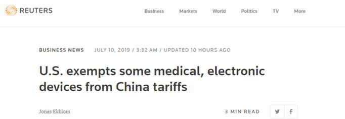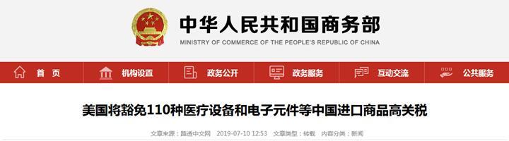 报道提到,美国自2018年7月6日起对价值340亿中国进口产品征收的25%的关税。特朗普政府9日公布的这份范围较小的豁免清单将自该日期起开始生效,并于周二(9日)起为期一年。 报道称,美国贸易代表办公室豁免了全球最大医疗设备制造商美敦力公司(Medtronic Plc)用于治疗肝脏肿瘤设备的一个部件,是该公司获批的12项豁免申请之一。美敦力公司宣称,研发投入较高的零部件并非在中国生产。 美国网络安全公司派拓网络(Palo Alto Networks Inc)的一种钽电容也获得关税豁免。报道称,这一电子元件用于控制网络防火墙设备中的电流。 此外,美国瓦里安医疗系统公司(Varian Medical Systems Inc)的部分放射治疗设备也获关税豁免。这家公司之前曾表示,关税只会让他们受伤,因为没有其它好的替代品可供选择,也将使其在与欧洲竞争对手的竞争中处于不利地位。 此外,路透社还提到,在此次宣布豁免前,美国贸易代表办公室在过去一年里已批准了1000项豁免申请。而在今年5月,美国贸易代表办公室拒绝了近1.3万项豁免申请中的5311项申请。 环球网记者注意到,中国商务部网站7月10日也转发了关于“美国将豁免110种医疗设备和电子元件等中国进口商品高关税”的相关报道。