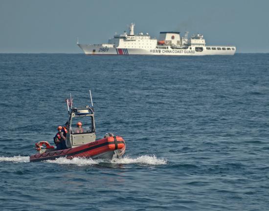 [环球网军事报道]近期美国海岸警卫队传奇级国土安全舰“斯特拉顿”号(USCGC STRATTON , 舷号WMSL752)一直在我国黄海和南海海域活动,但这艘美国海警船并不“孤单”,在美国国防部最新公布的照片中,该舰的不远处就是中国的万吨级海警船。