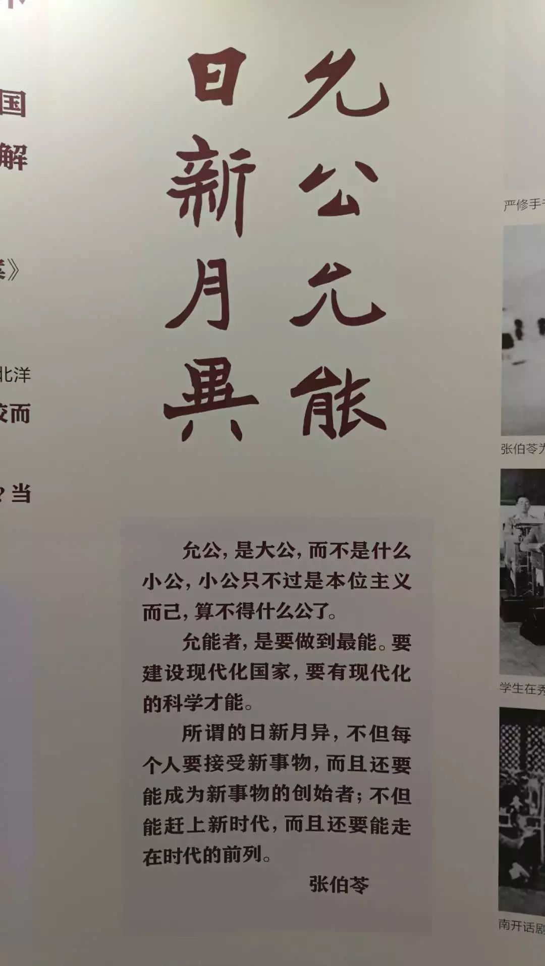 △校史主题展展板。张伯苓校长在1935年南开大学开学典礼上所问的三个问题——“张伯苓三问”。(央视记者石伟明拍摄) 2一个关乎国家命运的实验室