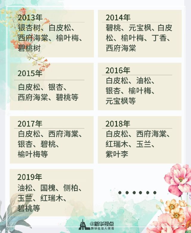 党的十八大以来, 每年春天, 习近平总书记都挥锹播绿, 身体力行参加首都义务植树活动。 这些年来 总书记都种了哪些树?