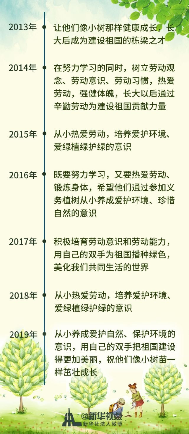 细心的人会发现, 每年参加植树活动, 总书记的身旁, 总有少先队员的陪伴。 总书记的叮嘱, 充满对下一代的期待。