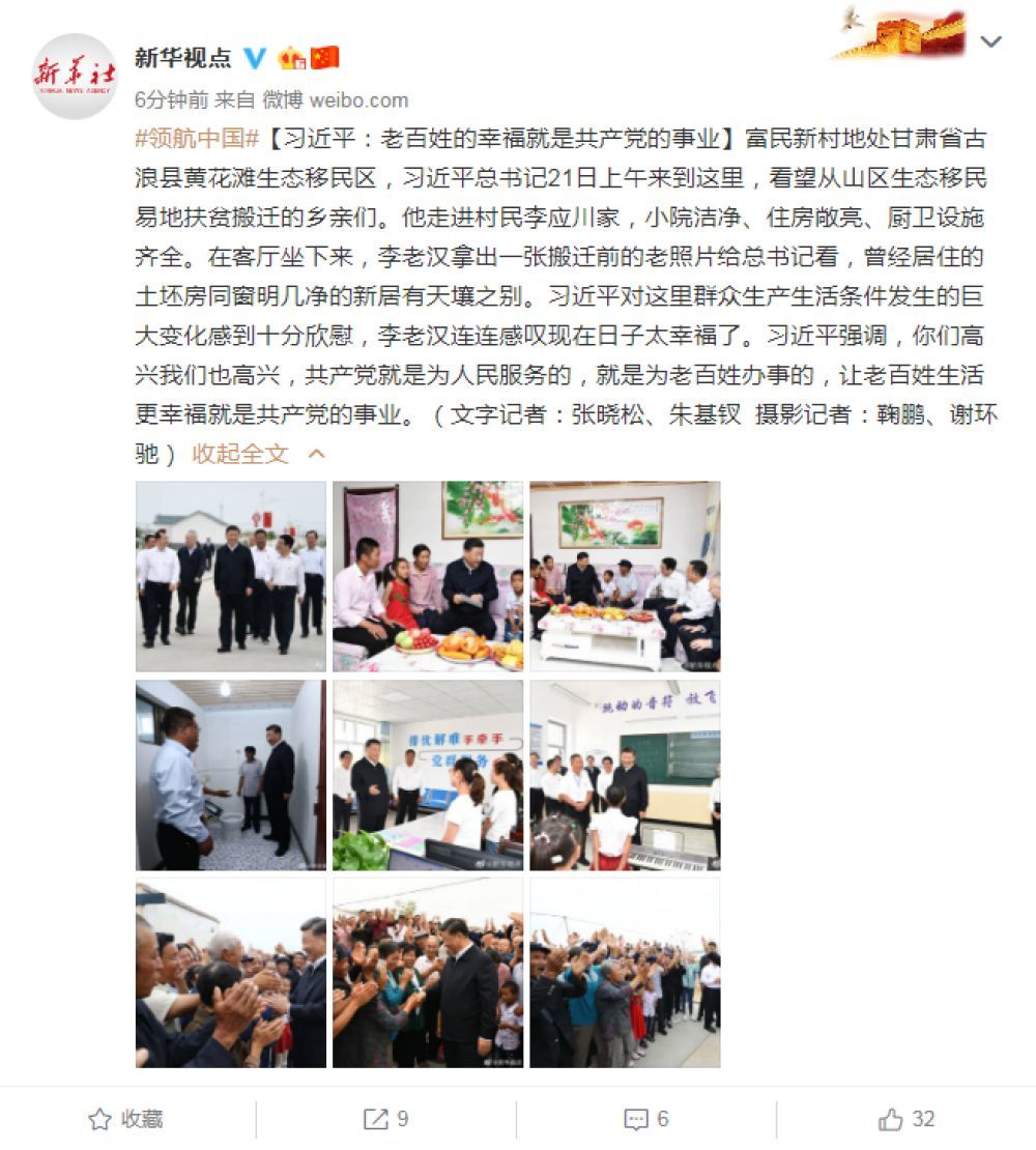 【习近平:老百姓的幸福就是共产党的事业】富民新村地处甘肃省古浪县黄花滩生态移民区,习近平总书记21日上午来到这里,看望从山区生态移民易地扶贫搬迁的乡亲们。他走进村民李应川家,小院洁净、住房敞亮、厨卫设施齐全。在客厅坐下来,李老汉拿出一张搬迁前的老照片给总书记看,曾经居住的土坯房同窗明几净的新居有天壤之别。习近平对这里群众生产生活条件发生的巨大变化感到十分欣慰,李老汉连连感叹现在日子太幸福了。习近平强调,你们高兴我们也高兴,共产党就是为人民服务的,就是为老百姓办事的,让老百姓生活更幸福就是共产党的事业。(文字记者:张晓松、朱基钗 摄影记者:鞠鹏、谢环驰)