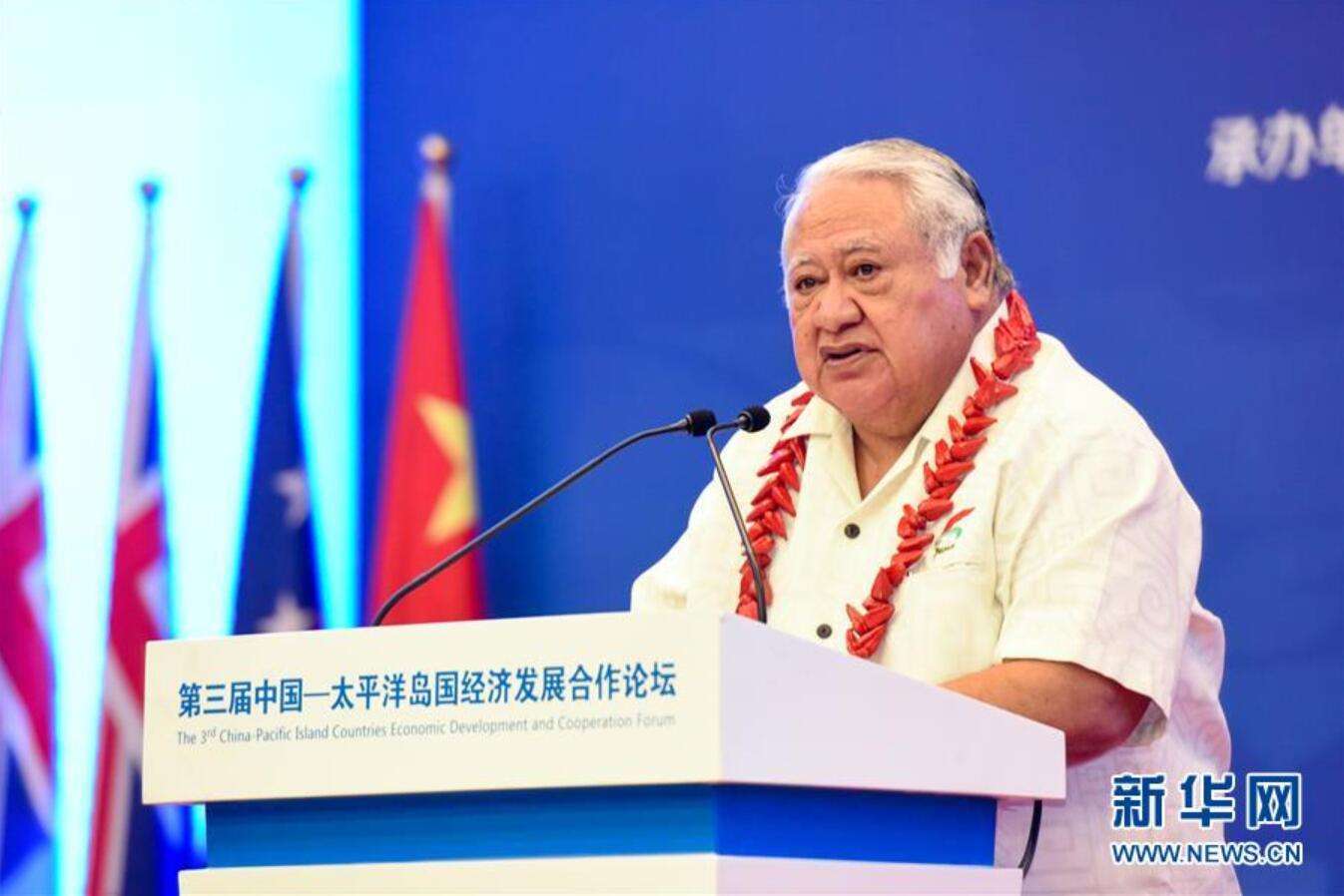 10月21日,在萨摩亚首都阿皮亚,萨摩亚总理图伊拉埃帕在开幕式上发表讲话。 第三届中国-太平洋岛国经济发展合作论坛21日在萨摩亚首都阿皮亚举行。 新华社记者 郭磊 摄 加强环保合作、促进经济社会可持续发展举措在不同领域、不同地区正全面开花。“举办第三届中国-太平洋岛国经济发展合作论坛是我同太平洋岛国领导人达成的重要共识,希望双方充分利用这一重要平台,加强对话、交流、合作,推动双方合作取得更大发展。”习近平在贺信中指出。 自2018年11月,中国与太平洋岛国领导人在巴布亚新几内亚决定将双方关系提升为相互尊重、共同发展的全面战略伙伴关系以来,双方关系快速发展。此次论坛就贸易、农林牧渔、旅游和基础设施投资、环境保护和气候变化等议题进行探讨,全方位开展中国与太平洋岛国交流与合作的新思路、新途径,将共同推动经济发展合作迈上新台阶。 “中国开放的大门只会越开越大,营商环境只会越来越好,为全球跨国公司创造的机遇只会越来越多。”习近平向首届跨国公司领导人青岛峰会致贺信中的这句话,同样加强了企业家们的合作信心。
