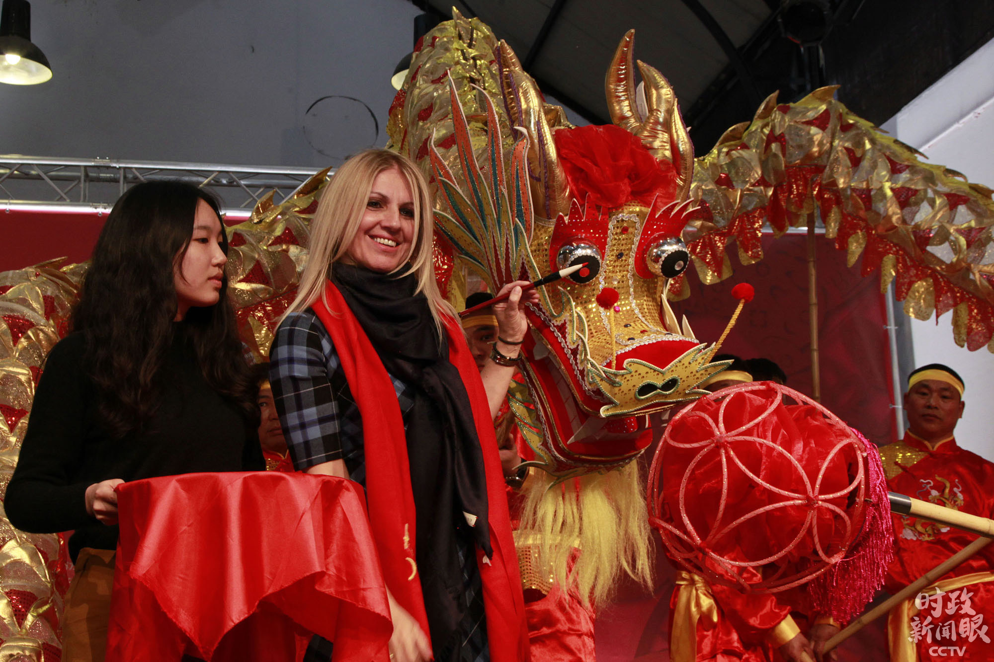 △雅典市副市长伊娃•孔托斯塔萨库在2019年雅典市“欢乐春节”活动中为龙点睛。(来源:雅典中国文化中心)