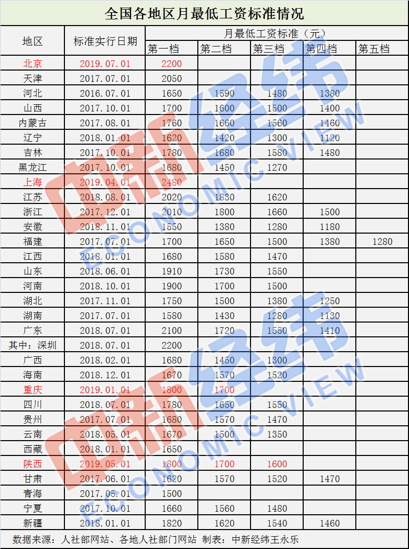 今年以来明确调整最低工资标准的地区至少有上海、北京、重庆、陕西等4省市。 其中,重庆从1月1日起,第一档职工月最低工资标准为1800元,第二档职工月最低工资标准为1700元,分别比原标准提高了300元。 上海从4月1日起,月最低工资标准从2420元调整到2480元,增加60元;小时最低工资标准从21元调整到22元。 陕西从5月1日起,一类工资区最低为1800元/月,二类工资区最低为1700元/月,三类工资区最低为1600元/月,分别比原标准提高了120元。 北京从7月1日起,月最低工资标准从2120元调整到2200元,增加80元;小时最低工资标准为24元,与原标准持平。 目前,上海、广东、北京、天津、江苏、浙江等6省份月最低工资标准均超过2000元,上海以2480元/月的最低工资标准居首位。 在小时最低工资标准方面,北京、上海、天津、广东的小时最低工资标准超过20元大关。 其中,北京小时最低工资标准依旧全国最高,为24元;上海次之,为22元;天津位居第三,达到20.8元;广东为20.3元,位居第四。 上海最低工资9连涨 多地年内或跟进