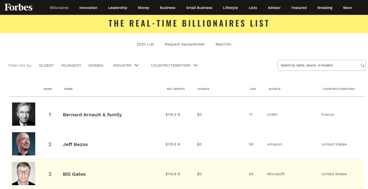 《福布斯》最新发布的世界富豪排行榜 据俄罗斯卫星通讯社报道,阿尔诺所持的路易威登集团股票上涨了0.7%,目前阿尔诺的资产总额达到1165亿美元(约合人民币7991亿元);而由于亚马逊的股票下跌了0.7%,贝佐斯以1156亿美元的财富总额位列富豪榜第二位;榜单的第三位是微软集团创始人比尔·盖茨,财富总额为1106亿美元;第四、五位分别是“股神”沃伦·巴菲特(906亿美元)和脸书创始人马克·扎克伯格(822亿美元)。