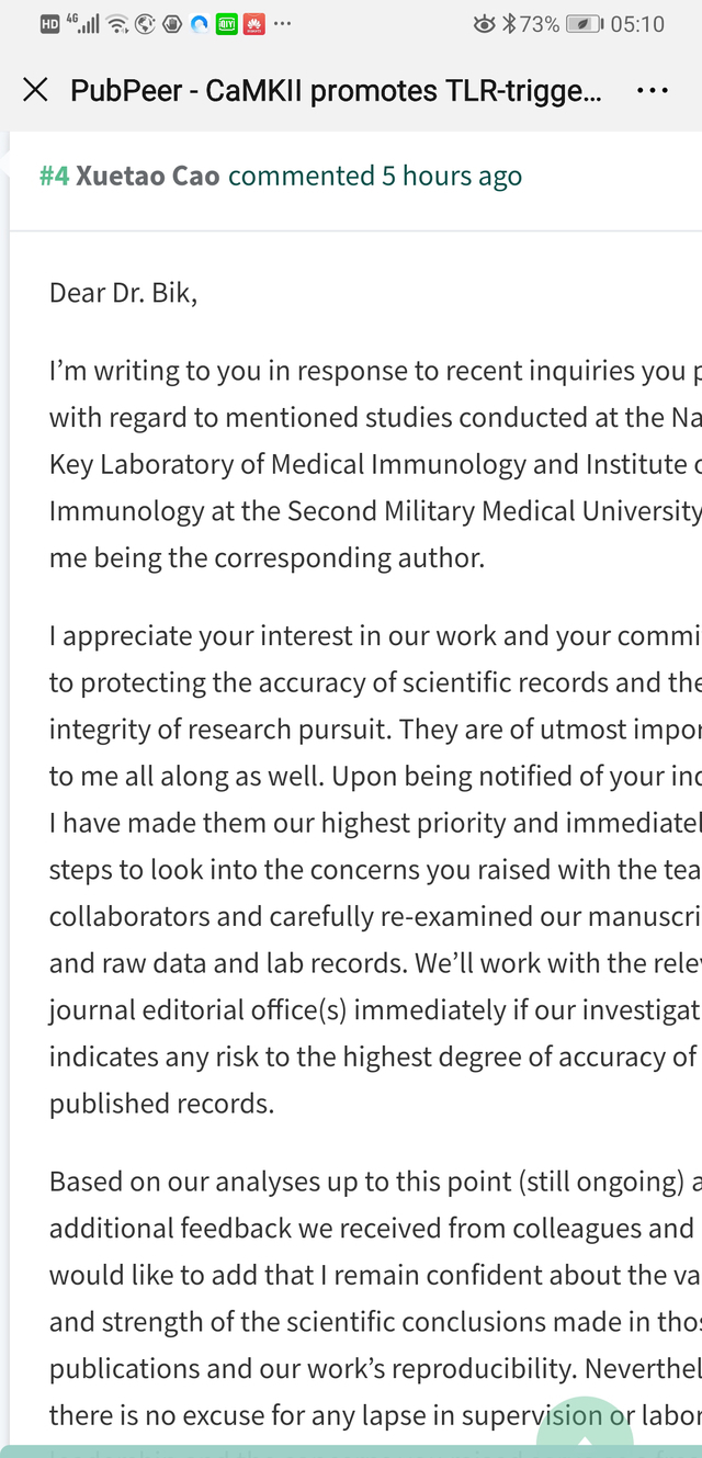 11月18日凌晨,中国免疫学家曹学涛院士在同行评议网站“pubpeer”发文,回应了学者伊丽莎白·比克(Elisabeth Bik)对他部分论文的质询。 11月14日起,伊丽莎白在该网站指出,以曹雪涛为通讯作者的多篇论文可能出现了图像造假问题。曹雪涛现任南开大学校长,是著名的免疫学家。此事引起了巨大关注。 这些论文涉及曹雪涛及其同事在医学免疫学国家重点实验室和第二军医大学免疫学研究所所做的部分研究工作。他在回应里首先对这位质疑者表示了感谢。“我感谢您对我们工作的兴趣,以及您对保护科学记录准确性和科研诚信的贡献——它们对我一直都是最重要的。” 曹雪涛表示,收到质询后,他已将此事列为“最高优先事项”,立即采取措施调查,仔细检查了手稿、原始数据和实验室记录。如果调查中发现对已发表记录的最高精度造成影响的任何风险,他们将立即与论文相关期刊编辑部合。 在回应中,曹雪涛还表示,对这些研究的分析仍在进行中。基于截至目前的分析,以及从同事和同行那里收到的补充反馈,他希望补充一点——“我仍然对这些论文中得出的科学结论的有效性、牢靠性以及研究的可重复性,充满信心。” 曹雪涛说,无论如何,在监管和实验室领导方面,没有任何借口出现失误。“您提出的关切再次提醒我,作为导师、主管和实验室的领导者,我的角色和责任有多重要,以及我可能已经出现了哪些不足。因此,我感到心情非常沉重,对我现在和以前的学生、工作人员和同事、同行和学术共同体感到极其抱歉。对于我的任何失察及由此带来的不便,我深表歉意。” 他还说,此事对自己来说是一次宝贵的学习机会,促使自己不仅要在推动科学发展方面,而且要在维护科学的准确性和完整性方面做得更好。 |