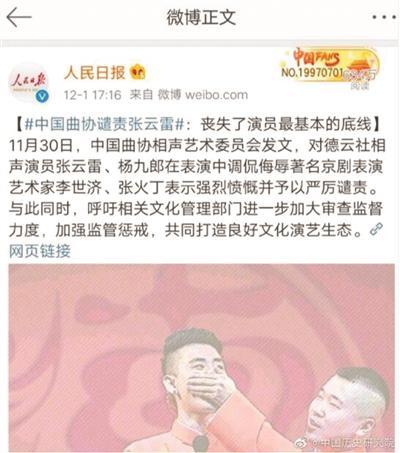 近日,中国曲协相声艺术委员会发文,对德云社相声演员张云雷、杨九郎在表演中调侃侮辱著名京剧表演艺术家李世济、张火丁表示强烈愤慨并予以严厉谴责。与此同时,呼吁相关文化管理部门进一步加大审查监督力度,加强监管惩戒,共同打造良好的文化演艺生态。 面对四面八方涌来的谴责声,张云雷似乎沉默了,直到12月2日,他的个人微博仍没有更新,最新的一篇停留在11月25日:“《重塑》,新生,你好。”《重塑》,是他的个人写真。 但是,张云雷的粉丝们反击了,他们开始四处深挖其他演员曾经的“低俗”材料。姜昆,净化相声舞台的倡导者,又被恶意攻击了。但张云雷的粉丝们有意无意地忽略了一个问题:他们挖掘出来的这些“包袱儿”曾出现于上世纪中央电视台“春晚”或者中央人民广播电台的广播节目里,不仅当时没人指其“低俗”,有的甚至被称为当时的经典。 苗阜也被张云雷的粉丝牵扯进去,被指责的段子来自于2011年。于是,中国历史研究院的官方微博发了这样一段文字:“无论张云雷还是苗阜,究竟是调侃还是诋毁,人民群众心如明镜。是领时代之风貌的曲艺大师,还是狺狺狂吠的跳梁者,历史终将做出评价。” 但很快,苗阜道歉了。12月2日9点23分,苗阜写道:“感谢大家的批评和监督!以前犯过的混不少……加入曲协后组织的教育培养使我从思想认识上有了极大提高,作为曲艺工作者没有起到正向作用是我的失职,苗阜再次道歉!!!今后若有不足,希望大家多提宝贵意见!一定虚心接受……” 一个半小时后,中国历史研究院对苗阜的话进行了评论:“‘任何犯错误的人,只要他不讳疾忌医,不固执错误,以至于达到不可救药的地步,而是老老实实,真正愿意医治,愿意改正,我们就要欢迎他。’” 此时,“德云社”官方微博的最新博文来自于11月29日,那是一个节目单;郭德纲,即张云雷的师父,个人微博的最新博文来自于凌晨3点35分,有9张照片,配的文字是“德云社相声巡演,迪拜站”。 不过,这一天的下午2点,德云社里有人发文支持张云雷了。杨进明,新近加入这个团队的“老”演员,他在微博上发表了一篇文章《送给张云雷的文章》。文章的第一句话便是:“是你推动了传统艺术的传承和发展。” “在他不遗余力的传承和带领下,在他正能量的传播下,受他榜样力量的影响,50、60、70、80、90、00后,走进剧院,去学习,去倾听戏曲、曲艺等中国传统文化,这个人就是——张云雷。” “把《锁麟囊》带进KTV”的张云雷仍然没有被程派艺术研究会所原谅。这一天,在自己的官方微信公号上,中国京剧程派艺术研究会发布了《关于相声艺人张云雷、杨九郎“辱程”事件的再次声明》。 这个“再次声明”里写道:“当年,程砚秋在京沪津等地演出时举城空巷的盛况,足以让张云雷、杨九郎等艺人望之形惭,程派舞台经典至今仍然拥有无数拥趸者,程派艺术实在不需要蹭任何人的热度。” “至于一些年轻观众因为张云雷的学唱才知道程派艺术,说明在京剧等传统戏曲艺术的传播方面,还有很多工作要做……” 新闻内存 中国曲协:呼吁文化部门加强监管惩戒 值得一提的是,11月30日,中国曲协相声艺术委员会则以《争做“有信仰、有情怀、有担当”的新时代曲艺工作者》为题发布声明。 声明称,近日,“网络爆出相声演员张云雷、杨九郎在表演中调侃侮辱著名京剧表演艺术家李世济、张火丁,这是他们拿地震灾难做‘哏’后又一次跌破道德底线,挑战公序良俗。此事件引起曲艺界乃至全社会广泛关注,产生了恶劣的社会影响。对此,我们表示强烈愤慨并予以严厉谴责。” |
