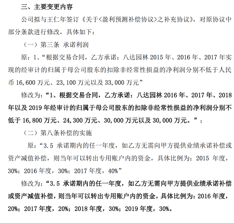 9月16日,由于迟迟不支付高达15亿元的业绩补偿款,深圳美丽生态股份有限公司(下称“*ST美丽”或“美丽生态”)自然人股东王仁年收到了深交所的公开谴责处分。由于标的资产八达园林上半年继续亏损,王仁年要完成2019年高达3亿元的业绩承诺也悬了。 2015年,*ST美丽斥资16.6亿元收购了八达园林100%股权。当时作为八达园林原实控人的王仁年承诺,八达园林2015年、2016年和2017年的扣非后归母净利润分别不低于1.66亿元、2.31亿元、3.30亿元。