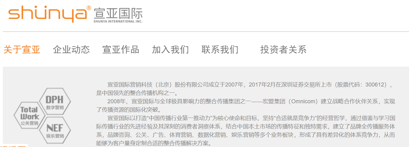半年报净利润降433% 宣亚国际成立于2007年1月,属于整合营销传播服务业,2017年2月登陆创业板,现在还属于上市未满三年的资本市场新兵。 但公司创始人张秀兵是公关行业的“老兵”。在公关行业刚刚传人中国不久的1996年,张秀兵参与成立北京迪思咨询有限公司,并担任总经理。2008年,张秀兵带领刚成立一年的宣亚国际与全球极具影响力的整合传播集团宏盟集团(Omnicom)建立战略合作伙伴关系。彼时圈内盛传宣亚国际与业内的嘉利、际恒以及蓝色光标等展开强势竞争。 上市之前,宣亚国际业绩保持稳定增长。2012年至2016年,宣亚国际实现的营业收入分别为3.01亿元、2.67亿元、2.67亿元、3.91亿元、4.67亿元,对应的净利润为0.08亿元、0.13亿元、0.08亿元、0.54亿元、0.59亿元。 然而,上市之后,宣亚国际只有首年延续了增长之势,此后便大幅下滑。2017年,公司实现的营业收入、净利润分别为5.05亿元、0.75亿元,同比增幅分别为7.93%,和27.67% 2018年年报显示,宣亚国际实现营业收入3.69亿元,同比减少26.80%;实现归属于上市公司股东的净利润2106.21万元,同比减少71.90%。 2019年半年报,宣亚国际业绩进一步下跌,当期营业收入1.28亿元,同比减少27.33%,实现归属于上市公司股东的净利润-866.24万元,同比减少432.95%。 到2019年三季报情况同样不乐观。宣亚国际2019年1-9月实现营业收入1.96亿元,同比下降27.51%,而同花顺金融研究中心称,同期传媒行业已披露三季报个股的平均营业收入增长率为2.39%。归属于上市公司股东的净利润-591.02万元,同比下降178.61%,而传媒行业已披露三季报个股的平均净利润增长率为-15.53%。在传媒行业整体业绩不景气的情况下,宣亚国际成为“重伤员”。 宣亚国际前三大行业客户为“汽车”、“互联网及信息技术”和“制造业”类公司。近两年汽车行业的不景气,对其营收及利润影响很大。2019年1-9月,公司源于汽车行业的收入为7202.57万元,占报告期营业收入的比重达到56.44%。相较于2017年和2018年47.60%和47.07%的占比进一步提升。 |