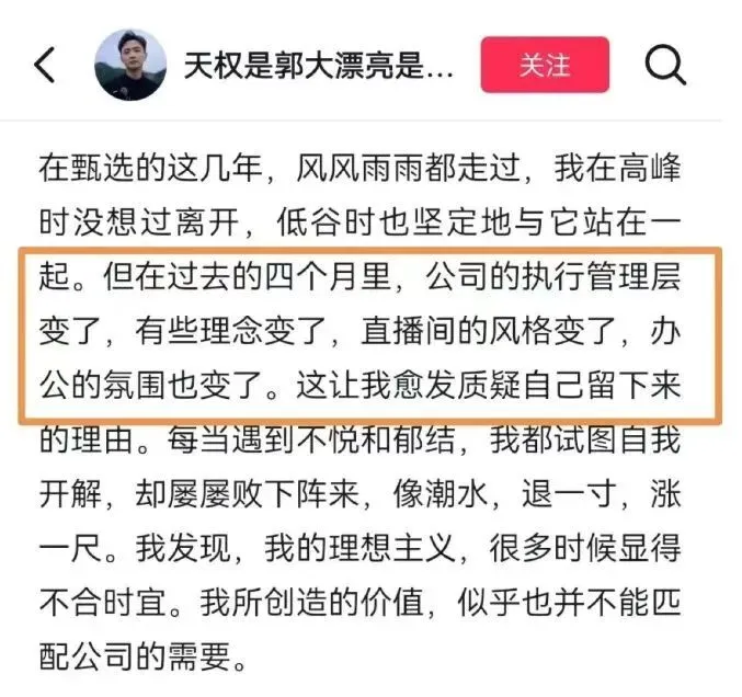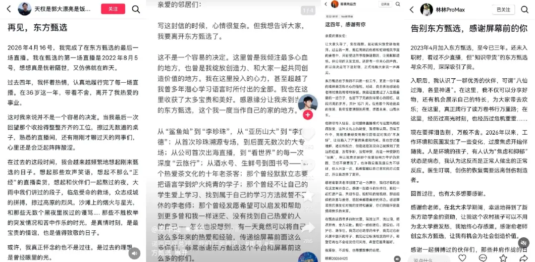 ![]() 四月的最后一周,东方甄选上演了一出F4全员离场的戏码。 明明、天权、中灿、林林,四名核心主播在两天内先后宣布辞职,矛头齐刷刷指向现任管理层。