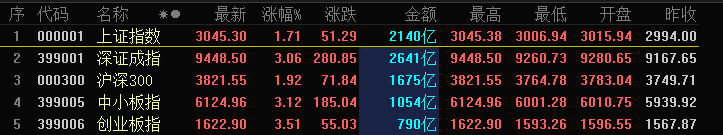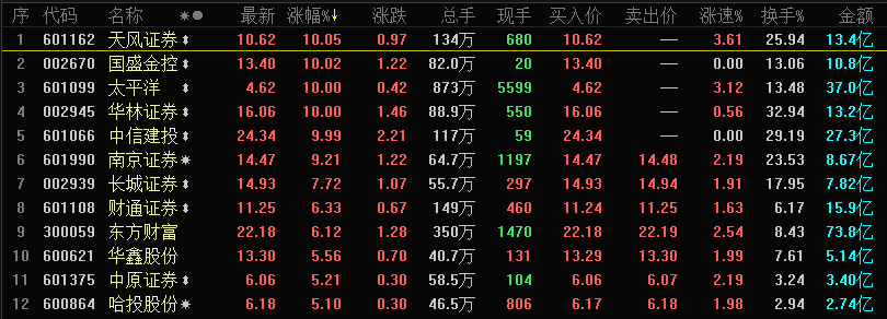 【11:30】 受到消息刺激,两市集体高开,沪指开盘便突破3000点大关,开盘之后创业板指迅速涨逾3%,市场题材概念极度活跃,随即大盘稍微回落,但总体指数稳步走强,此后两市持续拉升,超高清视频、边缘计算等新兴板块强势崛起,带动科技股走强,券商板块开盘后明显回调但快速拉升,市场涨停家数持续增多,临近午间收盘,指数持续拉升。 截止早盘收盘,沪指早盘收报3073.03点,涨2.64%,成交2702亿。深成指早盘收报9521.13点,涨3.86%,成交额3249亿。创业板早盘收报1641.73点,涨4.71%,成交额966亿。 券商板块领涨两市,板块涨幅超5%,成交量持续放大至近4500万,成交额超500亿!龙头中信建投再次涨停,太平洋证券、天风证券跟着涨停,南京证券逼近涨停,板块全线大涨。