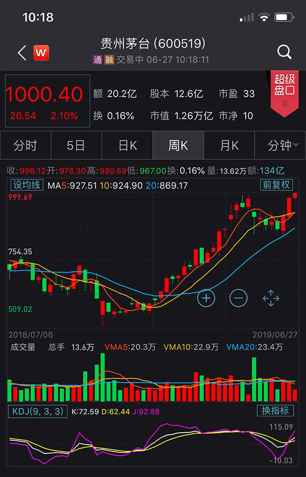 上午10时18分,贵州茅台股价突破1000元大关。 6月27日,贵州茅台(600519)股价开盘价979.86元/股,后一路上行。上午10时18分,贵州茅台突破1000元大关,市值1.256万亿元。 不过,随后贵州茅台股价略有回落。 3天之前,贵州茅台盘中股价曾突破990元/股历史高点,但最终破千未果。 可资比对的是,2018年贵州省GDP为14806.45亿元。 换句话说,一个贵州茅台的总市值,要占到贵州省GDP的近85%。 A股上一次出现千元股,还要追溯到27年前。 据证券时报e公司报道,“老八股”中曾诞生过两只千元股。曾经的“老八股”龙头真空电子,发行价就高达365元,一年半的时间里,股价连翻6倍。其股价在1992年4月14日便达到1030.10元(不复权,下同),此后一路上涨并在1992年5月25日,盘中一度涨至2587.50元。此后,真空电子更名为云赛智联,目前仍在A股上市,但当下股价只有7.81元。 官网资料显示,贵州茅台酒股份有限公司是由中国贵州茅台酒厂有限责任公司、贵州茅台酒厂技术开发公司、贵州省轻纺集体工业联社、深圳清华大学研究院、中国食品发酵工业研究所、北京糖业烟酒公司、江苏省糖烟酒总公司、上海捷强烟草糖酒(集团)有限公司等八家公司共同发起,并经过贵州省人民政府黔府函字(1999)291号文件批准设立的股份有限公司。 贵州茅台主要业务是茅台酒及系列酒的生产与销售。 2019年第一季度报告显示,贵州茅台一季度营业收入为216.44亿元,同比增长23.92%,归属于上市公司股东的净利润为112.21亿元,同比增长31.91%。 华创证券在6月2日发布的研报中表示,维持目前盈利预测,对贵州茅台12个月目标价予以当下估值平移,上调目标价至1150元。 华创证券称,茅台作为核心资产的稀缺性,作为最稳健资产的稀缺性,未来料将保障其高估值溢价的能力,更多比例长线价值理念资金入驻A股的趋势不会变,有理由相信贵州茅台估值国际化就在这两年。 |
