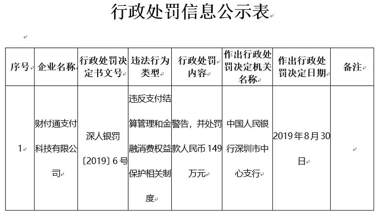 9月12日,央行深圳中心支行发布的处罚信息显示,腾讯旗下的财付通支付科技有限公司因违反支付结算管理和金融消费权益保护相关制度,被央行处以警告,并处罚款149万元。