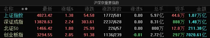 ![]() 凤凰网财经讯 1月5日,市场高开高走迎来2026年开门红,创业板指领涨,沪指重回4000点上方,录得十二连阳。截至收盘,沪指涨1.38%,深成指涨2.24%,创业板指涨2.85%。沪深两市成交额高达2.55万亿,较上一个交易日放量5011亿。
