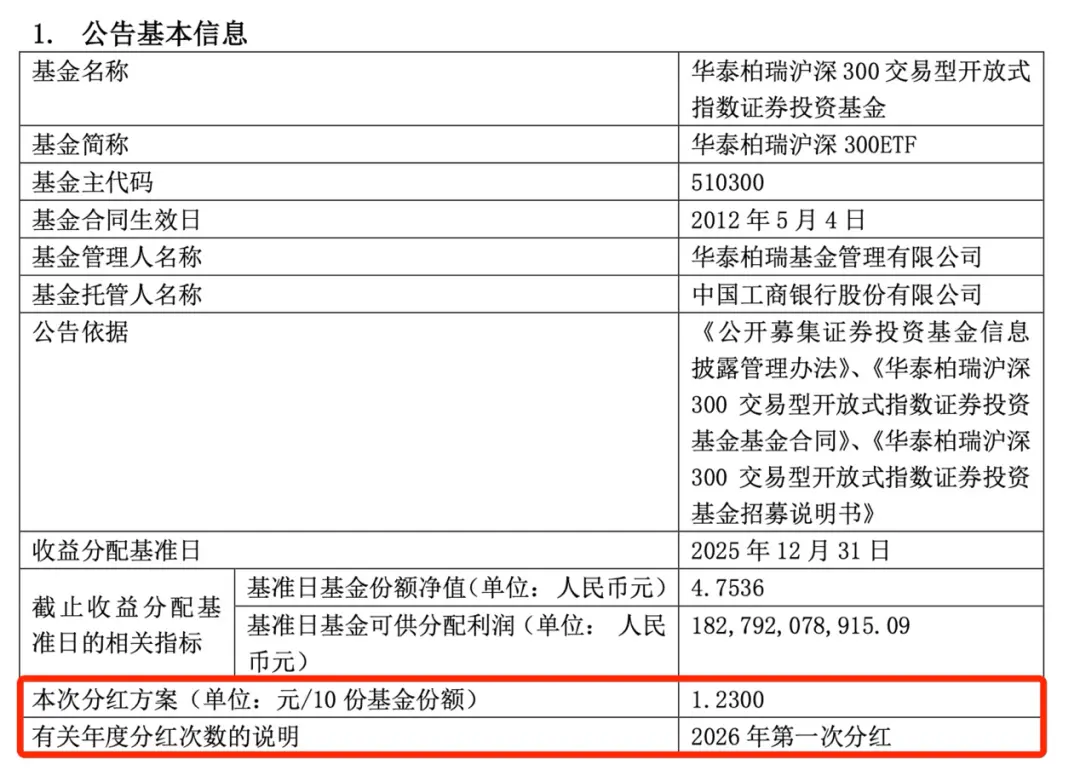 ![]() 牛市行情推动下,国内ETF分红纪录再次被刷新! 1月11日,华泰柏瑞基金发布公告称,旗下沪深300ETF将实施现金分红,每10份基金份额分红1.23元,分红权益登记日为2026年1月16日,除息日为2026年1月19日,现金红利发放日为2026年1月27日。