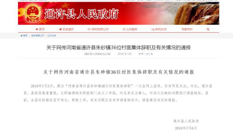 澎湃新闻见习记者 赵思维 7月6日,就网传"河南通许县朱砂镇36位村医集体辞职"一事,通许县人民政府在其官网发布通报称,已抽调相关职能部门成立工作组,约见有关当事人,对该文反映的问题进行调查核实。