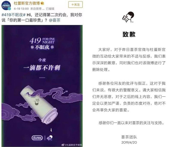 跨界却过界,网友直呼“吐了” 4月19日,喜茶HEYTEA与杜蕾斯在微博互动,文案为“第一口最珍贵”,海报配文为“今夜一滴都不许剩”。随后,喜茶在该条微博下评论:“你唇上始终有我的芝士”。众所周知,杜蕾斯是知名避孕套品牌,因而这样的文案也不得不让人浮想联翩。