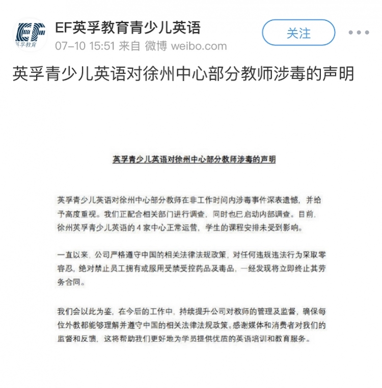 7月10日下午,英孚教育青少儿英语就徐州中心7名外教因吸毒被抓事件作出回应,称正配合相关部门调查,对违规违法行为零容忍,禁止员工拥有或服用受禁受控药品及毒品,发现即终止其劳务合同,今后将提升对教师的管理及监督。 近年来,面向青少儿英语培训的热度居高不下,不少教育培训机构对于外教招聘缺乏相应的要求与审核。南都记者从一家外教中介服务网站随机选取10家教育培训机构查看招聘信息,发现有一半机构未按规定要求应聘外教者提供相应资质。 为谋取利益,一些中介机构推荐无教学资质外国人从事外教工作,有中介每月从中获利3/4。还有不法分子将目光瞄准境外,以虚假证明组织外国人入境当外教,最终受到相应处罚。 涉毒: 英孚7名外教因吸毒被抓,回应将解聘涉案者 7月10日0时04分,徐州市公安局泉山分局官方通报,经依法侦查破获一起涉毒案件,截至目前共抓获涉毒人员19人,其中16人为外籍人员(7人为某教育机构外教,另9人为学生)。 通报称,经检验19人吸毒尿检均呈阳性。目前,1名外籍人员被依法刑拘,18名涉毒人员被行政拘留。 对此,英孚教育青少儿英语通过官方微博发布声明称,对徐州中心部分教师在非工作时间内涉毒事件深表遗憾,给予高度重视。正配合相关部门进行调查,同时也启动内部调查。目前,徐州英孚青少儿英语的4家中心正常运营,学生的课程安排未受到影响。