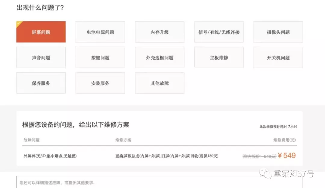 ▲“极客修”平台上,对于外屏碎裂情况,明确注明更换屏幕总成并回收旧屏。