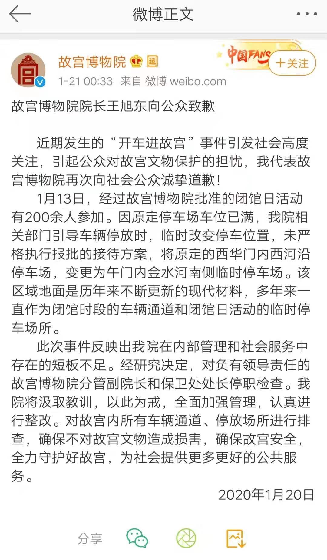 内容如下: “近期发生的“开车进故宫”事件引发社会高度关注,引起公众对故宫文物保护的担忧,我代表故宫博物院再次向社会公众诚挚道歉! 1月13日,经过故宫博物院批准的闭馆日活动有200余人参加。因原定停车场车位已满,我院相关部门引导车辆停放时,临时改变停车位置,未严格执行报批的接待方案,将原定的西华门内西河沿停车场,变更为午门内金水河南侧临时停车场。该区域地面是历年来不断更新的现代材料,多年来一直作为闭馆时段的车辆通道和闭馆日活动的临时停车场所。 此次事件反映出我院在内部管理和社会服务中存在的短板不足。经研究决定,对负有领导责任的故宫博物院分管副院长和保卫处处长停职检查。我院将汲取教训,以此为戒,全面加强管理,认真进行整改。对故宫内所有车辆通道、停放场所进行排查,确保不对故宫文物造成损害,确保故宫安全,全力守护好故宫,为社会提供更多更好的公共服务。” 故宫就此事的第一次发声,是在1月17日有网民发布“周一开车进入故宫”事件的当天,故宫方面当时表示此事经核查属实。“故宫博物院对此深表痛心并向公众诚恳致歉。今后,我院将严格管理,杜绝此类现象。感谢社会各界对故宫博物院的关爱与监督。” 图片来源:微博截图