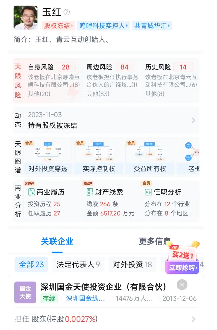 此时的币安,自身也正处多事之秋。根据相关消息,创始人赵长鹏虽在2025年10月获得特朗普政府赦免,但其在2024年4月因反洗钱问题被判处四个月监禁的经历,以及联合创始人何一的共同卷入的事件,都让这一巨头形象受损。 至于360集团,此前经历了一段业绩承压期,2022年至2024年360连续三年录得亏损。进入2025年后,经营状况呈现改善迹象。财报显示,2025年前三季度360实现营业总收入60.68亿元,同比增长8.18%;归母净利润虽仍亏损1.22亿元,但较上年同期5.79亿元的亏损额已收窄。 至于这场突如其来的“反目”原因何在?除了商业恩怨,玉红自身的处境也值得关注。 天眼查显示,玉红目前任职的23家企业中,多家已被吊销或其持有的股份被冻结。