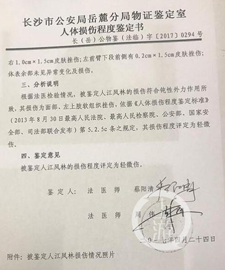 江凤林轻微伤鉴定书 行政复议后处罚减轻 公安局和市政府成被告 肢体冲突发生后,湘雅三医院报警,长沙市公安局岳麓分局银盆岭派出所民警出警处理。 2017年5月17日,岳麓分局作出处罚:刘庭白扰乱单位秩序,处以罚款五百元的治安行政处罚。江凤林对此处罚不服,向长沙市人民政府复议。 2017年8月14日,长沙市人民政府作出行政复议决定书:岳麓分局的处罚属适用法律错误,决定撤销该处罚决定,并责令岳麓分局重新作出行政处罚。 |