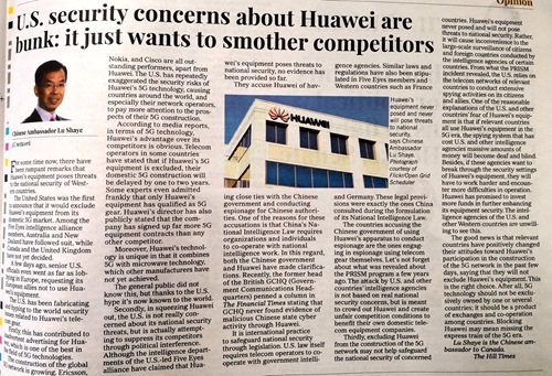 新京报快讯 据中国驻加拿大大使馆官网消息,2月27日,卢沙野大使在加拿大《国会山时报》发表题为《关于“华为设备危害国家安全”的几点思考》的署名文章。全文如下: