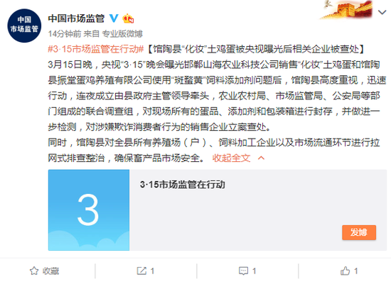新京报快讯 据国家市场监督管理总局官方微博消息,3月15日晚,央视"3·15"晚会曝光邯郸山海农业科技公司销售"化妆"土鸡蛋和馆陶县振堂蛋鸡养殖有限公司使用"斑蝥黄"饲料添加剂问题后,馆陶县高度重视,迅速行动,连夜成立由县政府主管领导牵头,农业农村局、市场监管局、公安局等部门组成的联合调查组,对现场所有的蛋品、添加剂和包装箱进行封存,并做进一步检测,对涉嫌欺诈消费者行为的销售企业立案查处。 同时,馆陶县对全县所有养殖场(户)、饲料加工企业以及市场流通环节进行拉网式排查整治,确保畜产品市场安全。