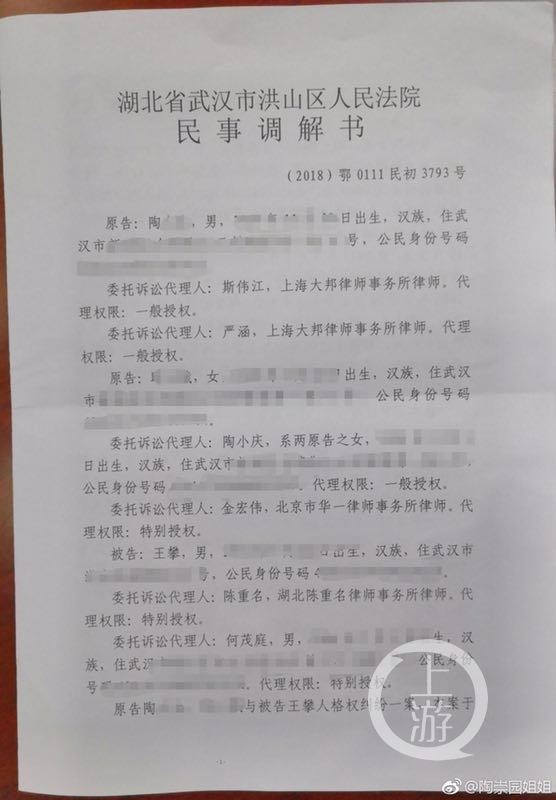 3月25日晚,一年前坠楼身亡的武汉理工大学研究生陶崇园的姐姐发布微博称:“时隔一年,王攀终于认错道歉了。”该微博所附的调解书显示,陶崇园的研究生导师王攀除道歉外,还赔偿了陶崇园家属65万元。 上游新闻(报料微信号:shangyounews)记者从陶家代理律师金宏伟处证实了上述微博内容的真实性。