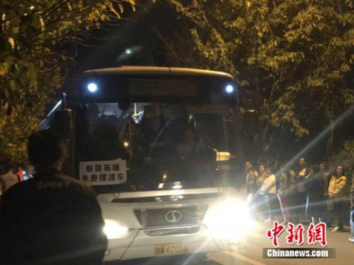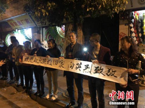 载有最后6名凉山木里森林火灾救援人员遗体的车队缓缓驶入西昌市。刘忠俊 摄 " 我们今天就是来送英雄'最后一程'的。"看着路过的车队,凉山市民张璐不住擦拭自己红肿的眼睛。她说,这次火灾中有24位"90后"英雄牺牲,和自己的女儿一样大,一想到这里,心里就特别难过。 " 迎接救火英雄回家,向英烈致敬。"姜坡路上有6人合力拉起横幅,向遇难英雄致哀。"对于扑火人员,每一次'逆行'都是生与死的考验,我们不能只被'逆行者'保护,也要最大限度保证'逆行者'的安全。"市民王萍感慨。 西昌公交司机杨子拉结束了白班的工作后,来到姜坡路义务担任起"祭奠英雄免费摆渡车"的司机。"我希望能给这些看望英雄的好心人提供方便。"等候乘客上车的空隙,杨子拉朝着殡仪馆的方向鞠躬致意。他说,从下午到现在自己一共开了13趟,每一趟大巴车都挤满了前来悼念的市民。