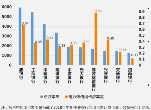 图片来自最高法中国司法大数据研究院发布《金融诈骗司法大数据专题报告》。 信用卡诈骗涉诉银行啥特征? ——邮政储蓄银行信用卡涉案量最高,招行最低 上述报告还显示,近三年来,信用卡诈骗案件主要涉诉银行为农行(案件量占比22.32%)、工行(20.46%)和中行(15.91%)。 发卡量排名前五的工行、建行、招行、中行和农行,其每万张信用卡涉案量分别为0.35件、0.29件、0.11件、0.41件和0.64件,招行涉案风险最低。 |