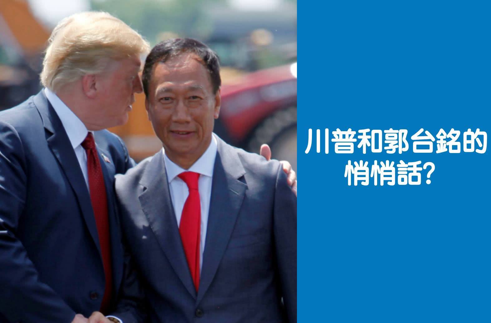 郭台铭上月31日在社交媒体上贴招人广告,却放上自己和美国总统特朗普的照片,并附文“川普和郭台铭说悄悄话?”,引起外界联想其是否要“弃商从政”参选2020岛内领导人位置。6日,郭台铭首次正面回应称没有意愿。
