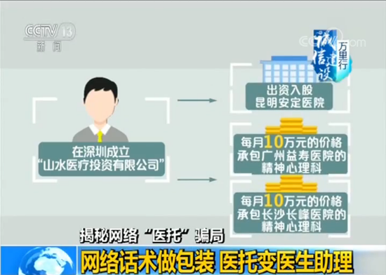 根据深圳警方介绍,这起“医托”案件幕后的出资人为福建人苏某闪,他在深圳成立了“山水医疗投资有限公司”,出资入股了昆明安定医院,另外还以每月10万元的价格,分别承包了广州益寿医院和长沙长峰医院的精神心理科,而这3家医院均为民营医院。