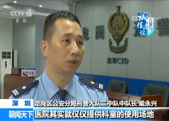 深圳龙岗区公安分局刑警大队二中队中队长 梁永兴:医院其实就仅仅提供科室的使用场地,科室的医生、设备、护士等等一切跟医疗有关的运作,所有的仪器、器械、人员都是由苏某(闪)来招聘,买进来的,跟医院其实是没有关系的,只是它挂了医院的名称。