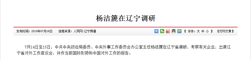 7月14日至15日,中共中央政治局委员、中央外事工作委员会办公室主任杨洁篪在辽宁省调研,陪同调研的还有中央外事工作委员会办公室副主任刘建超。
