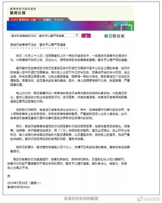 另据观察者网讯 香港中环等几个地区昨天(28日)出现非法游行集结,有示威者和警方对峙,并曝发冲突。香港警方今天凌晨公布,目前有49人涉及非法集会及藏有攻击性武器被拘捕。 据香港大公网7月29日报道,继前日在元朗非法集会搞事后,乱港暴徒昨日又再次非法游行集结。暴徒采用兵分多路、分散警力的战术,从中环分别攻向铜锣湾、西环方向,有人扬言靠人多抢警察装备甚至“杀警”。商场、店铺被迫落闸,港岛交通严重受阻。 暴徒在大街小巷四处纵火,更自制“火焰冲车”撞向警队防线。暴徒武力再升级,配备弓箭、燃烧弹等高杀伤力武器,又在小巷暗处以丫叉向警员发射玻璃弹珠,并从高处掷砖块、路牌等“空袭”警员。 面对暴力升级,警队果断执法,再次成功挫败暴力抗法、践踏法治的暴徒,获社会各界高度赞扬。香港警方凌晨公布拘捕至少49人,涉及非法集结及藏有攻击性武器等罪名。香港警方29日在其网站表示,激进示威者的行为越演越烈,由最初拆铁栏、掷铁枝和砖头,及至到处纵火和大肆破坏。香港警方予以强烈谴责。警队有决心、有能力,将违法人士绳之于法。