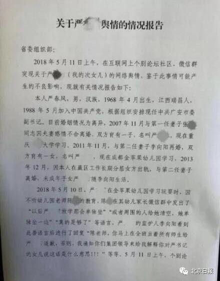 此事引发广泛关注,“严书记”的真实身份也被逐渐曝光。 5月12日,网上出现一封“严书记”写给四川省委组织部的情况说明。情况说明里表示:因为前妻李某出轨,自己已和李某离婚五年,孩子归李某带,因此严春风本人对一切问题都不知情。该说明没有被媒体证实,也没有被严春风本人否认。