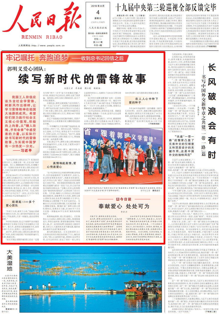 中南海连着最基层,人民领袖和人民群众心贴心。 党的十八大以来,习近平总书记多次给基层干部群众回信。从脱贫攻坚,到志愿服务;从大学校园,到民营企业;从祖国边疆,到创新一线……一封封回信,饱含深情、字字暖心、催人奋进,体现着心心相印的人民情怀,蕴含着对治国理政的深刻思考,表达着对奋进新时代的殷切希望。 人民日报推出“牢记嘱托 奔跑追梦——收到总书记回信之后”系列报道,与您一起见证发展变化、感悟初心使命。今天(8月4日)刊发第三篇《郭明义爱心团队:续写新时代的雷锋故事》。