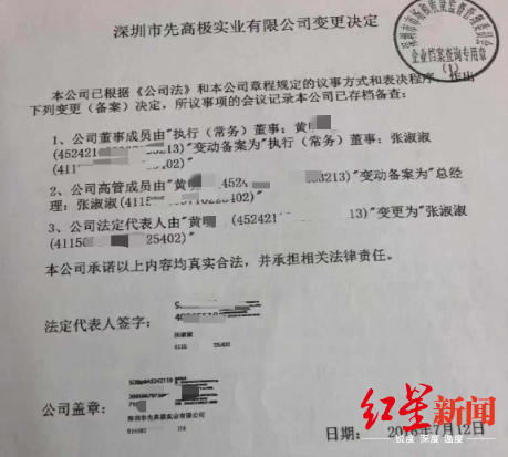 深圳市市场监督管理局信用处一名负责人告诉红星新闻,经过调查了解,前述报道中提到的张淑淑担任法人代表与执行董事的公司深圳市先高极实业有限公司(下文称:先高极),注册于2016年4月19日,注册时通过数字证书办理。公司注册时法人代表和执行董事并非张淑淑,而是黄某某,张淑淑只是经办人。当年7月12日,公司再次通过数字证书签名将公司法人代表和执行董事变更成了张淑淑。