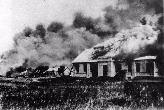 △正在燃烧的东北军驻地北大营 日本在中国东北 建立了伪满洲国傀儡政权 开始了长达14年之久的 奴役和殖民统治 抗日战争自此拉开序幕