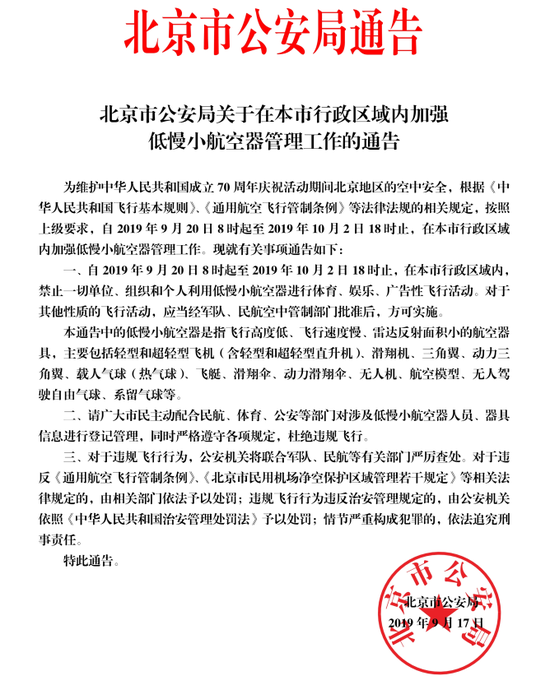 原标题:9月20日至10月2日18点 北京禁飞低慢小航空器 北京青年报记者9月17日获悉,北京市公安局将于2019年9月20日8时起至2019年10月2日18时止在本市行政区域内加强低慢小航空器管理。 为维护中华人民共和国成立70周年庆祝活动期间北京地区的空中安全,根据《中华人民共和国飞行基本规则》、《通用航空飞行管制条例》等法律法规的相关规定,按照上级要求,自2019年9月20日8时起至2019年10月2日18时止,在本市行政区域内加强低慢小航空器管理工作。现就有关事项通告如下: 一、自2019年9月20日8时起至2019年10月2日18时止,在本市行政区域内,禁止一切单位、组织和个人利用低慢小航空器进行体育、娱乐、广告性飞行活动。对于其他性质的飞行活动,应当经军队、民航空中管制部门批准后,方可实施。 本通告中的低慢小航空器是指飞行高度低、飞行速度慢、雷达反射面积小的航空器具,主要包括轻型和超轻型飞机(含轻型和超轻型直升机)、滑翔机、三角翼、动力三角翼、载人气球(热气球)、飞艇、滑翔伞、动力滑翔伞、无人机、航空模型、无人驾驶自由气球、系留气球等。 二、请广大市民主动配合民航、体育、公安等部门对涉及低慢小航空器人员、器具信息进行登记管理,同时严格遵守各项规定,杜绝违规飞行。 三、对于违规飞行行为,公安机关将联合军队、民航等有关部门严厉查处。对于违反《通用航空飞行管制条例》、《北京市民用机场净空保护区域管理若干规定》等相关法律规定的,由相关部门依法予以处罚;违规飞行行为违反治安管理规定的,由公安机关依照《中华人民共和国治安管理处罚法》予以处罚;情节严重构成犯罪的,依法追究刑事责任。
