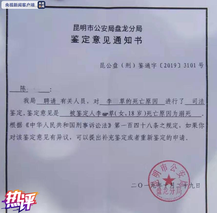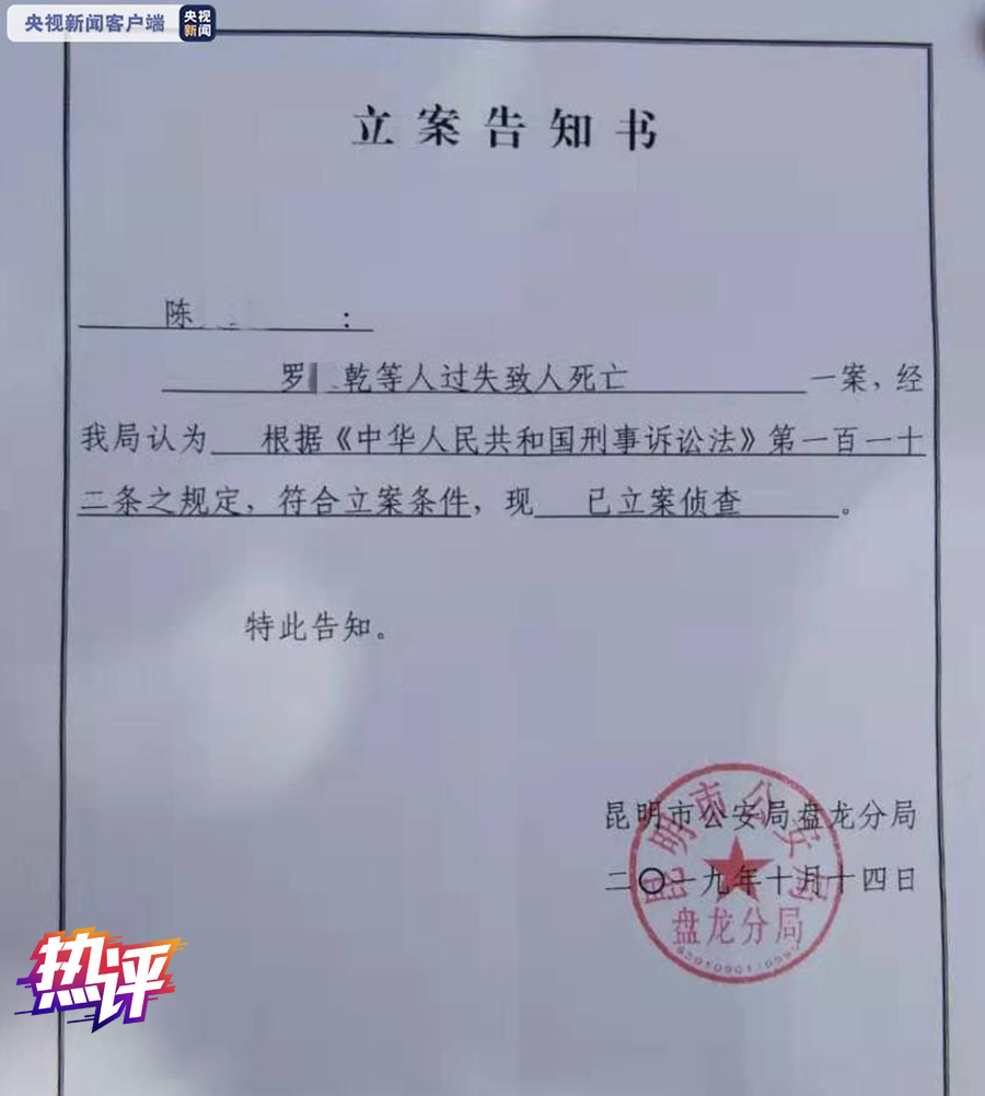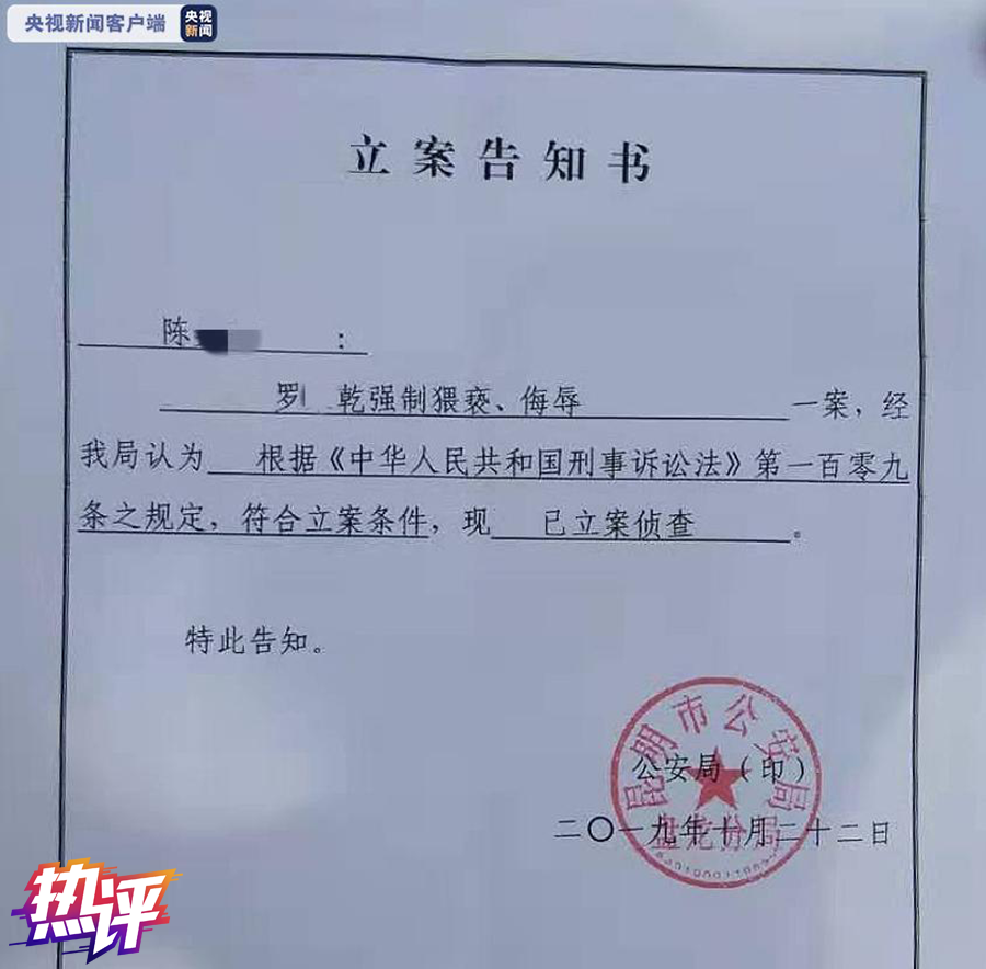 10月31日央视新闻报道,云南昆明李某草家属收到的立案通知书显示,近日,昆明市公安局对罗某乾强制猥亵、侮辱一案立案侦查。备受社会关注的李某草死亡案,向公正迈出重要一步。