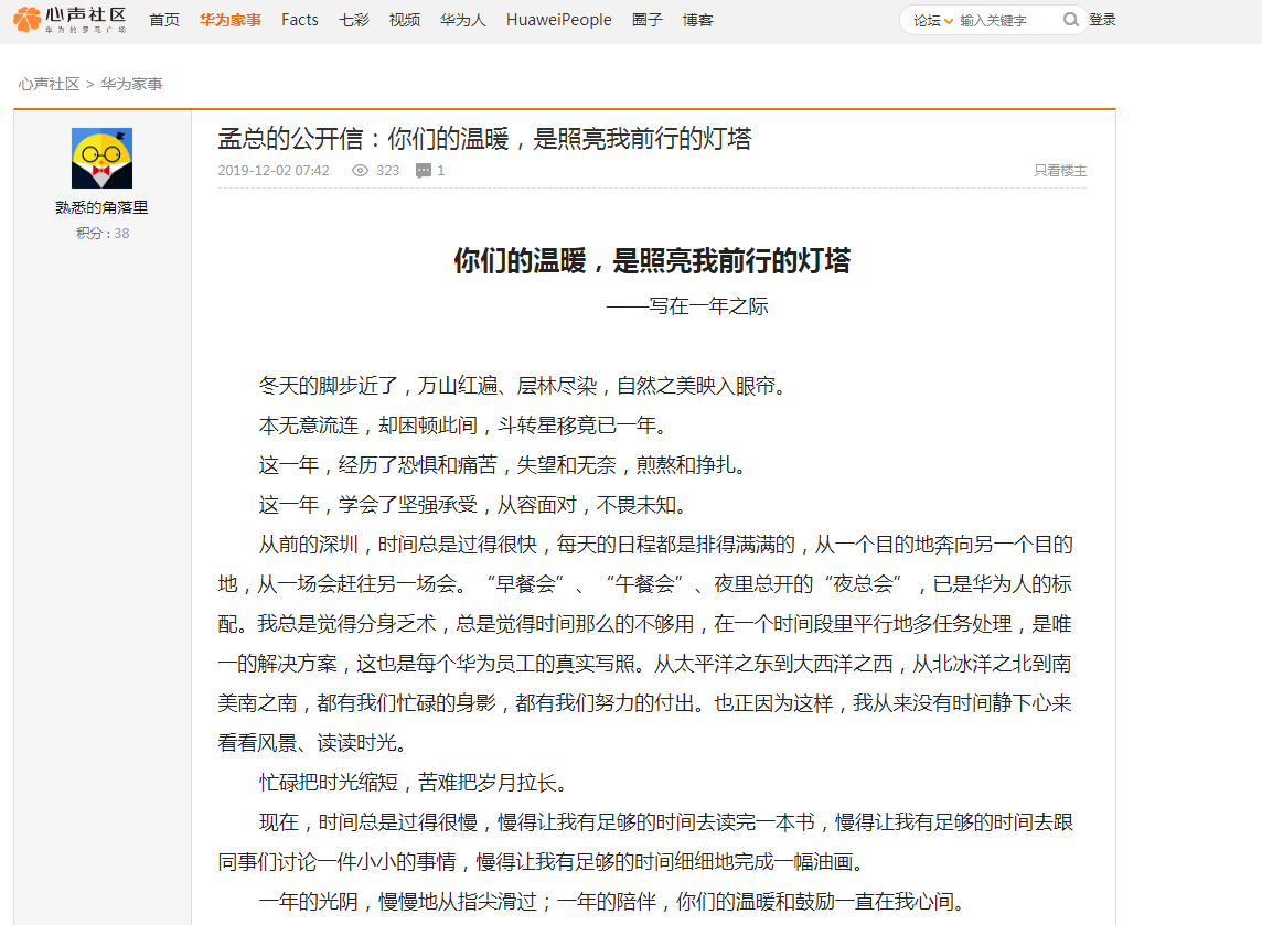 华为“心声社区” 截图 【环球网报道 记者 朱梦颖】在被加拿大拘押一周年之际,华为“心声社区”12月2日发布了一封孟晚舟12月1日写于加拿大温哥华的公开信。孟晚舟在信中说,这一年,经历了恐惧和痛苦,失望和无奈,煎熬和挣扎。这一年,学会了坚强承受,从容面对,不畏未知。在信中,孟晚舟还感谢大家对她的温暖和鼓励,“亲爱的你们,这些温暖都是照亮我前行的灯塔!”2018年12月1日,孟晚舟在温哥华机场被加拿大警方拘押,至今未获自由。 你们的温暖,是照亮我前行的灯塔 ——写在一年之际 冬天的脚步近了,万山红遍、层林尽染,自然之美映入眼帘。 本无意流连,却困顿此间,斗转星移竟已一年。 这一年,经历了恐惧和痛苦,失望和无奈,煎熬和挣扎。 这一年,学会了坚强承受,从容面对,不畏未知。 从前的深圳,时间总是过得很快,每天的日程都是排得满满的,从一个目的地奔向另一个目的地,从一场会赶往另一场会。“早餐会”、“午餐会”、夜里总开的“夜总会”,已是华为人的标配。我总是觉得分身乏术,总是觉得时间那么的不够用,在一个时间段里平行地多任务处理,是唯一的解决方案,这也是每个华为员工的真实写照。从太平洋之东到大西洋之西,从北冰洋之北到南美南之南,都有我们忙碌的身影,都有我们努力的付出。也正因为这样,我从来没有时间静下心来看看风景、读读时光。 忙碌把时光缩短,苦难把岁月拉长。 现在,时间总是过得很慢,慢得让我有足够的时间去读完一本书,慢得让我有足够的时间去跟同事们讨论一件小小的事情,慢得让我有足够的时间细细地完成一幅油画。 一年的光阴,慢慢地从指尖滑过;一年的陪伴,你们的温暖和鼓励一直在我心间。 华为的同事们在心声社区上一次又一次地留言,任何一个关于我的消息,都能筑起高楼。 我们的客户和供应商们,在这个至暗时刻,选择了给予我们更多的信任、支持和等待,这当然也成为我们更加努力的动力。 每次庭审,法庭外都排起长长的队伍,大家的热情和支持一直暖在我的心头。 我还听同事说,有外卖小哥在我们的外卖单上留言:“华为加油”、“华为努力”,寥寥几字足以让我们瞬间温暖。这些点点滴滴都支持着我们勇往直前。 还有无数的网友们,常常在各种与华为相关的新闻下跟帖,有的温暖,有的坚定,有的绵长,有的精练,有的深情款款,有的质朴如兰,无不表达对我们的信任与支持,还有一如既往的关心。