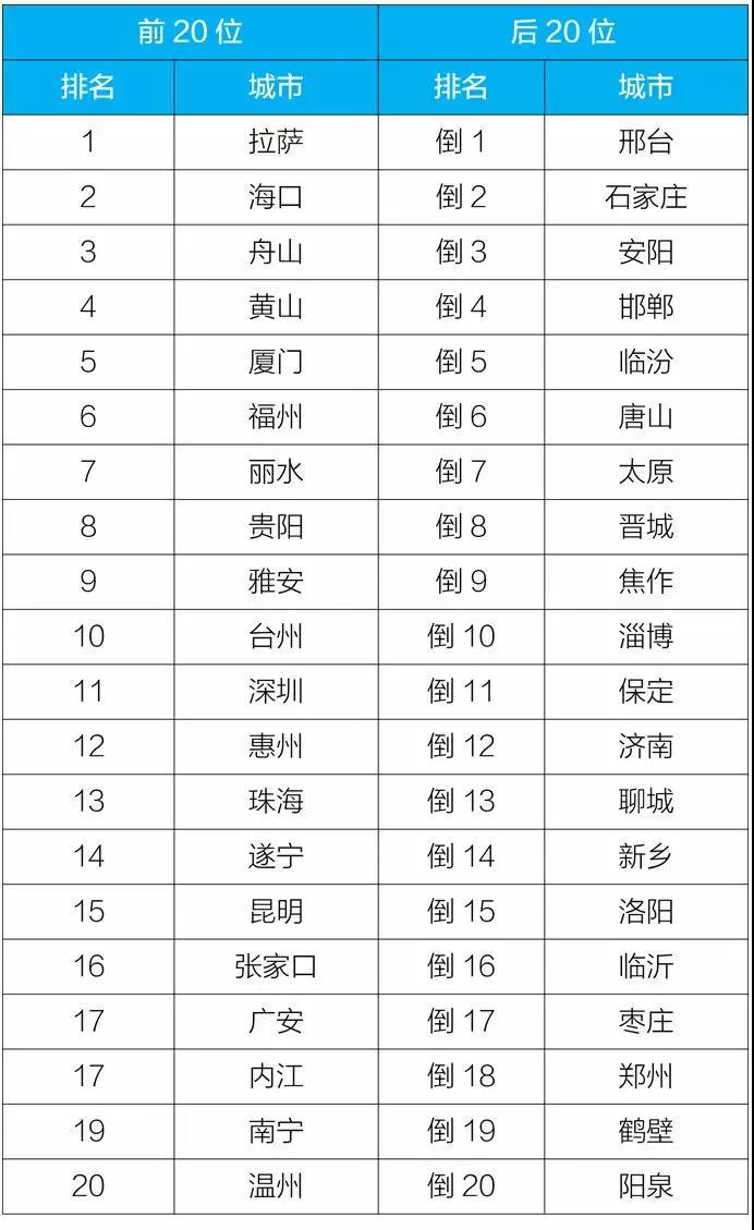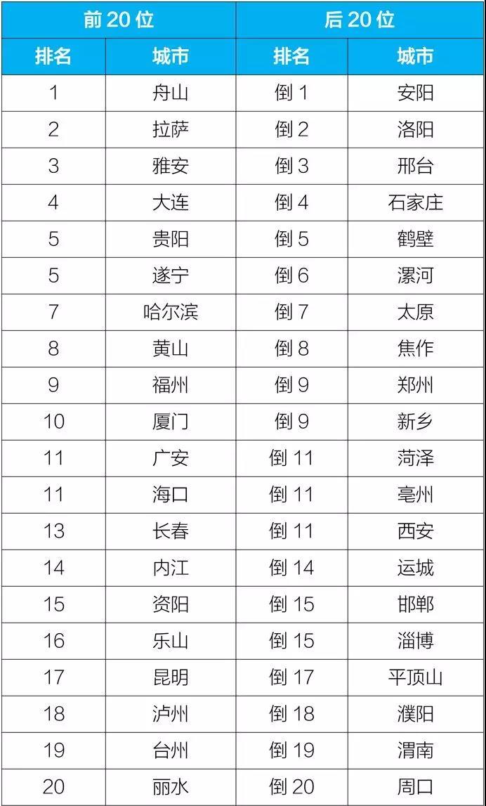 △来源:生态环境部 另外,根据生态环境部公布的数据显示,2019年1-11月,168个重点城市中邢台、石家庄、安阳市等城市空气质量相对较差;拉萨、海口、舟山市等城市空气质量相对较好。 2019年1-11月168个重点城市排名 前20位和后20位城市名单